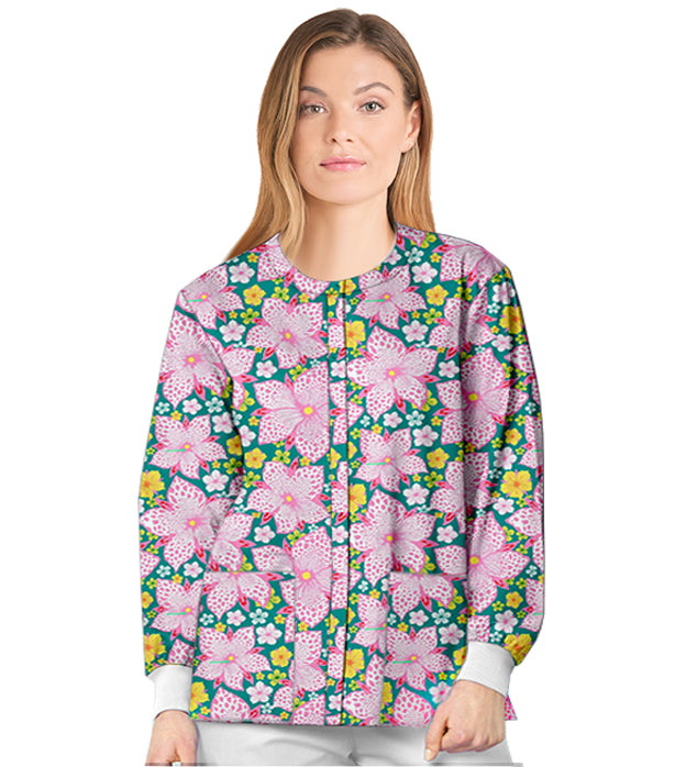 Poplin Unisex Scrub Jacket with Pink & Yellow Blossom Print- 2 Pockets, Full Sleeves with Rib