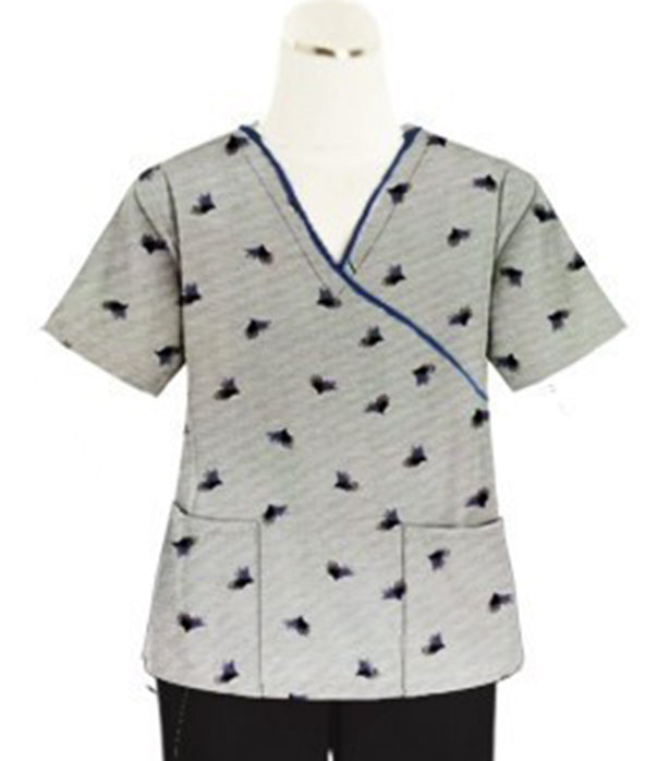 Poplin Women Black Leaf Print Scrub Top mock wrap 3 pocket half sleeve with black piping