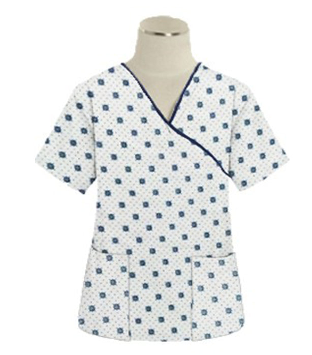 This Women Printed Scrub Mock Wrap Top in Green Square Print is made from premium Poplin Printed Fabric, crafted from 35% Cotton, 65% Polyester. This Printed Scrub Mock Wrap Top is available in sizes ranging from XXS to 12XL.