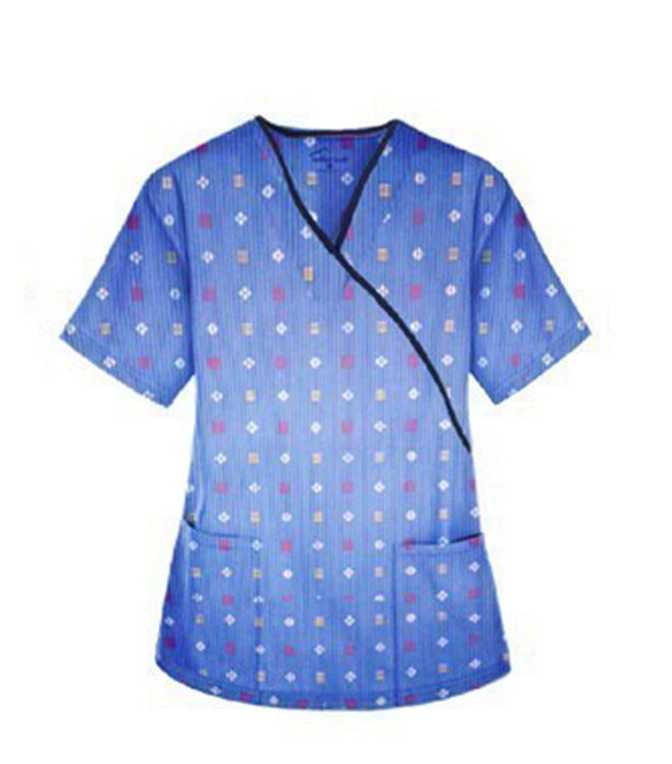 This Women Printed Scrub Mock Wrap Top in Shapes Print is made from premium Poplin Printed Fabric, crafted from 35% Cotton, 65% Polyester. This Printed Scrub Mock Wrap Top is available in sizes ranging from XXS to 12XL.