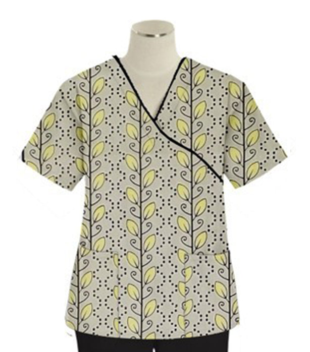 Poplin Women Yellow petal and Grey Print Scrub Top mock wrap 3 pocket half sleeve with black piping